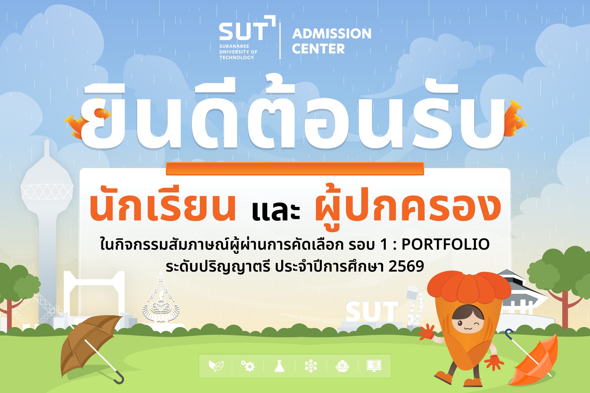 สัมภาษณ์ รอบที่ 1 Portfolio ปีการศึกษา 2569 มหาวิทยาลัยเทคโนโลยีสุรนารี (มทส.) จัดกิจกรรมสัมภาษณ์ผู้ผ่านการคัดเลือกเข้าศึกษาระดับปริญญาตรี ปีการศึกษา 2569 รอบที่ 1 Portfolio โดยมีนักเรียนเข้ารับการสัมภาษณ์กว่า 3,000 คน ในกลุ่มสาขาวิชาวิศวกรรมศาสตร์ เทคโนโลยีการเกษตร เทคโนโลยีสังคม วิทยาศาสตร์ ศาสตร์และศิลป์ดิจิทัล และสาธารณสุขศาสตร์ พร้อมจัดประชุมนักเรียนและผู้ปกครอง เพื่อให้ข้อมูลเกี่ยวกับสาขาวิชาต่าง ๆ รวมถึงนำชมห้องปฏิบัติการ หอพักนักศึกษา และบรรยากาศโดยรอบมหาวิทยาลัย เมื่อวันที่ 18 ตุลาคม 2568