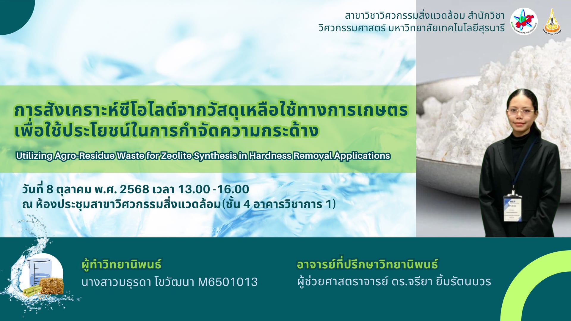 ขอแสดงความยินดีกับ นางสาวมธุรดา โขวัฒนา นักศึกษาระดับ ป.โท ได้สอบป้องกันวิทยานิพนธ์หัวข้อ “การสังเคราะห์ซีโอไลต์จากวัสดุเหลือใช้ทางการเกษตร เพื่อใช้ประโยชน์ในการกำจัดความกระด้าง” ผ่านในระดับดีมาก ในวันที่ 8 ตุลาคม 2568 และขอขอบพระคุณคณะกรรมการสอบวิทยานิพนธ์ทุกท่านที่ให้คำแนะนำกับนักศึกษา เพื่อนำไปใช้ประโยชน์ในการทำงานวิจัยต่อไป