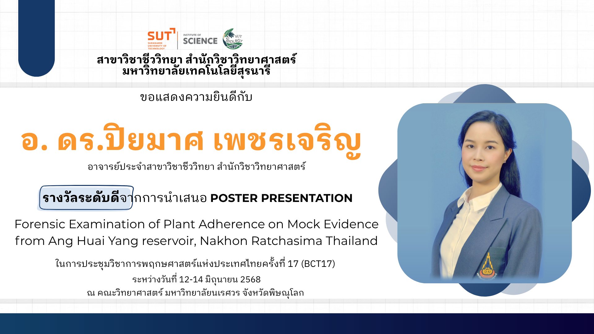 สาขาวิชาชีววิทยา ขอแสดงความยินดีกับ อ. ดร.ปิยมาศ เพชรเจริญ อาจารย์ประจำสาขาวิชาชีววิทยา ที่ได้รับรางวัลจากงานประชุมวิชาการพฤกษศาสตร์แห่งประเทศไทยครั้งที่ 17 (BCT17) ระหว่างวันที่ 12-14 มิถุนายน 2568 ณ คณะวิทยาศาสตร์ มหาวิทยาลัยนเรศวร จังหวัดพิษณุโลก 01 ธันวาคม 202501 ธันวาคม 2025sukanyamข่าวสาร ผลงาน/รางวัลFacebook iconFacebookTwitter iconTwitterLINE iconLine