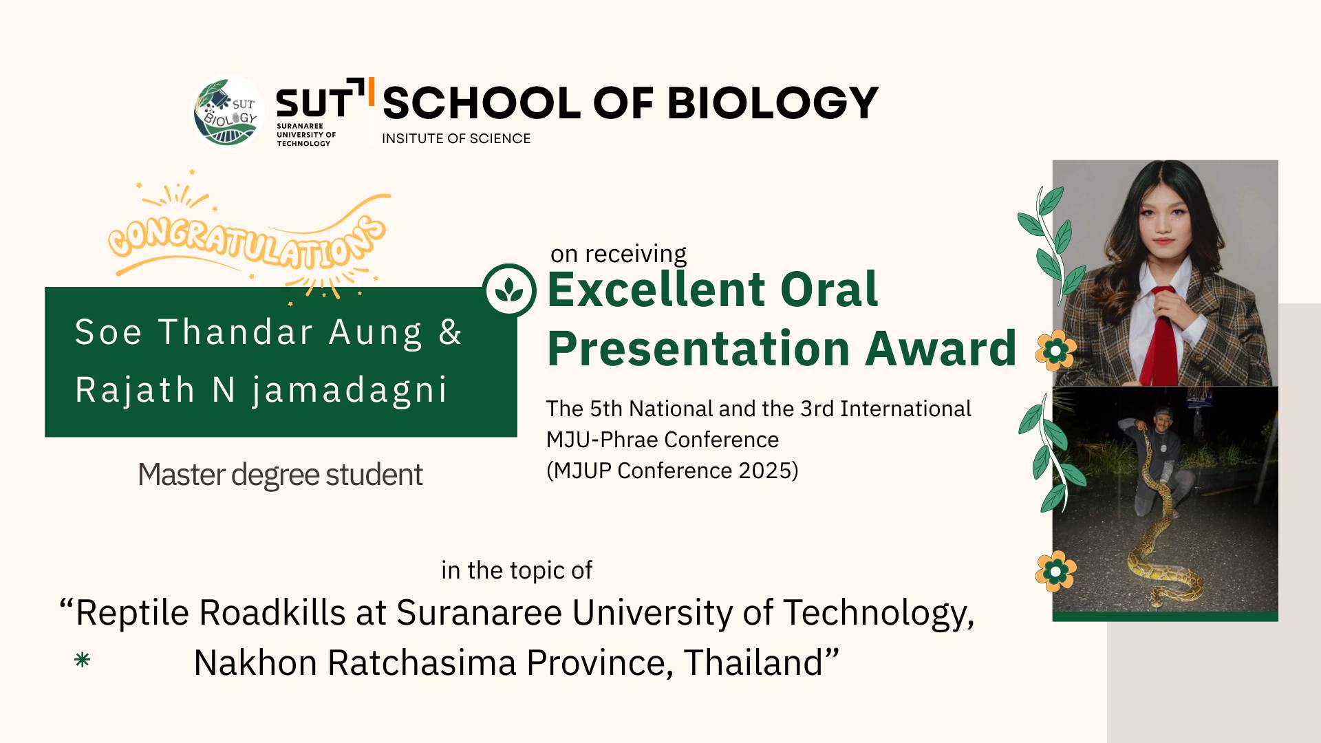 We’re proud to celebrate our Master’s students, Soe Thandar Aung and Rajath N. Jamadagni, who were jointly awarded the Excellent Oral Presentation Award and the Very Good Oral Presentation Award at the 5th National and 3rd International MJU-Phrae Conference (MJUP Conference 2025) 🏆✨